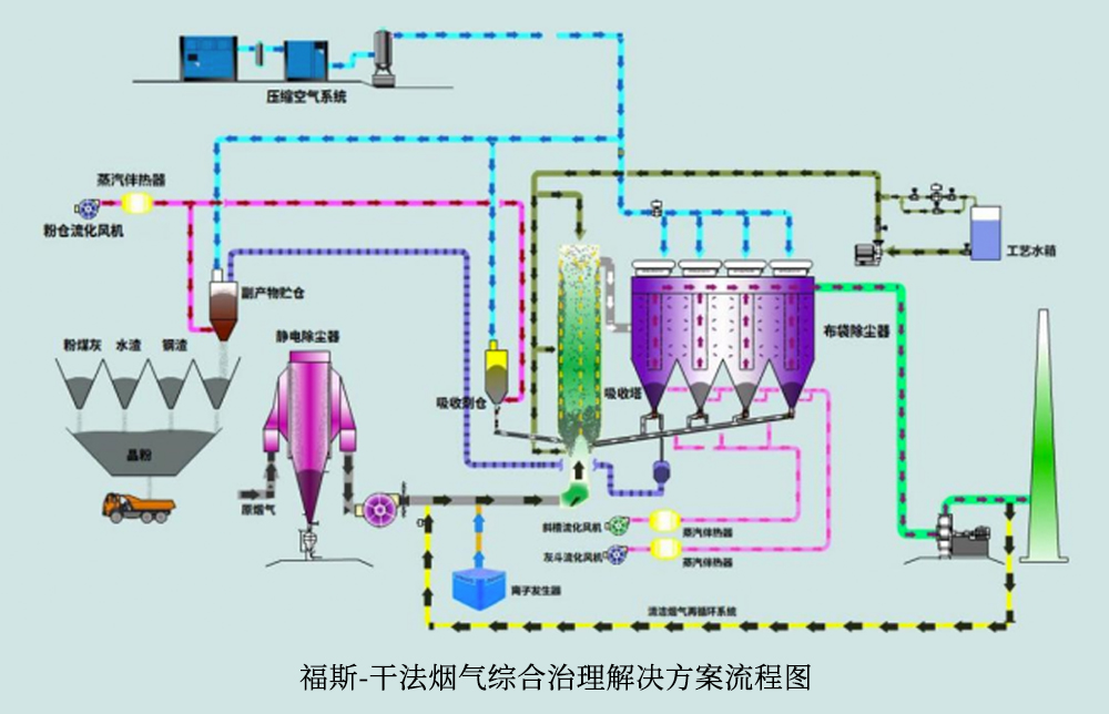 福斯干法(FOSS-D)技術是以福斯離子發生器、堿性高分子材料、技術升級的強效脫除反應塔為核心的一體化協同治理技術。該技術完美融合了單一脫硫、單一脫硝、CFB半干法、活性焦干法等工藝優勢。可實現一塔脫除多種污染物(脫硫、脫硝、脫二噁英、脫氟),具有較好的經濟性與可持續性。